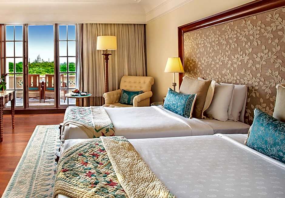 Guests enjoy views of the gardens and the Taj Mahal from the private balcony.